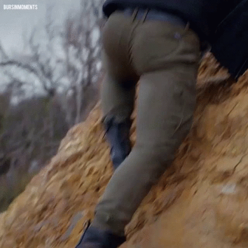 Kerem Bursin climbing a steep dirt hill outdoors, wearing a dark jacket and olive green pants.
