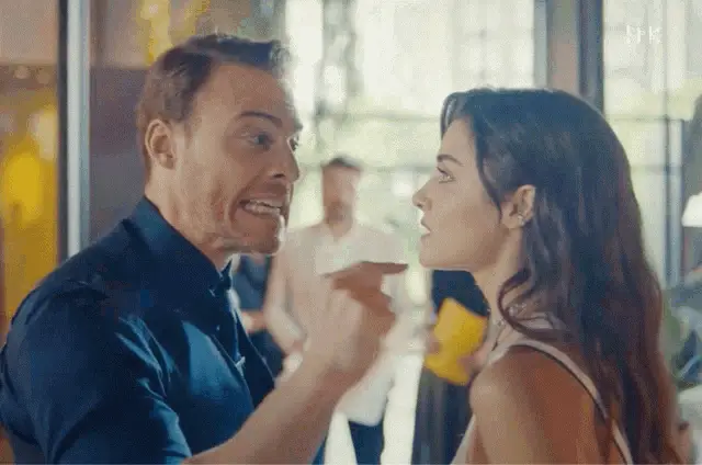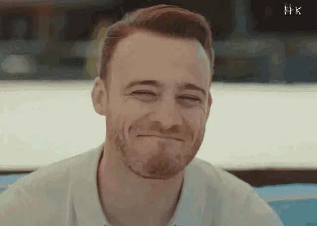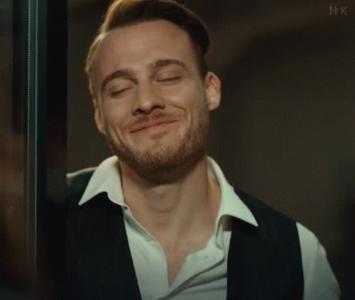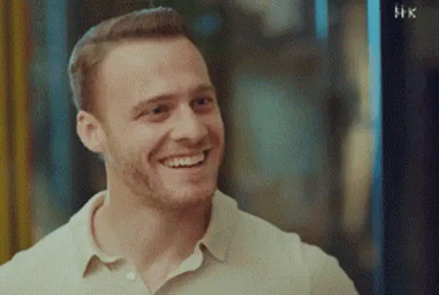 Kerembursin, portraying Serkan Bolat, smiles broadly with his eyes closed, wearing a white shirt and dark vest.