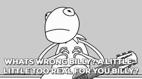 A Kermit-like character asks a scared Billy if something is 'a little too real' for him.