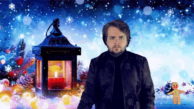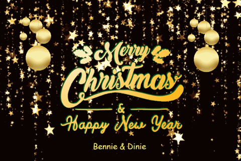 A festive Merry Christmas and Happy New Year greeting from Bennie & Dinie, featuring golden stars and ornaments.