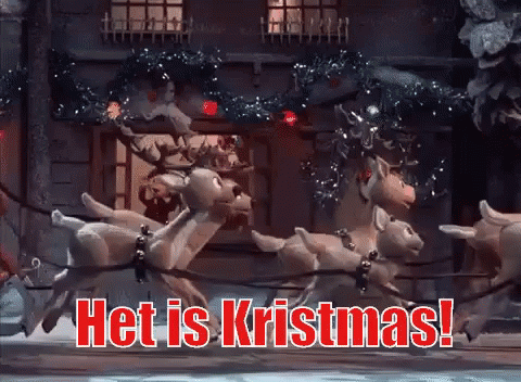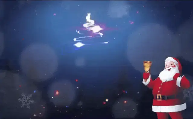Santa Claus flies in his sleigh pulled by reindeer past a festive house, as children wave from the window.