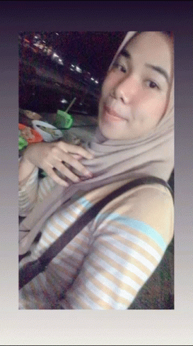 A woman in a hijab and a man share a funny moment while eating outdoors at night.