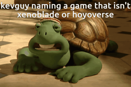 Kevguy struggles to name a game that isn't Xenoblade or Hoyoverse, featuring a thinking turtle meme.