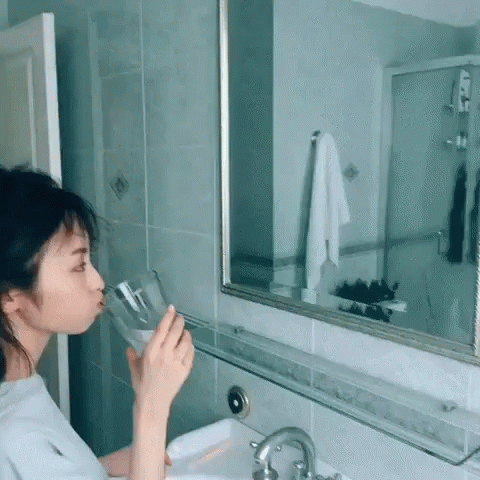 Imaizumi Yui of Keyakizaka46 gargles water in a bathroom, then smiles brightly at the camera.