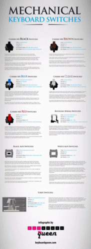 Detailed infographic showcasing various mechanical keyboard switches like Cherry MX, Alps, and Buckling Spring, with their types, activation forces, and key travel.