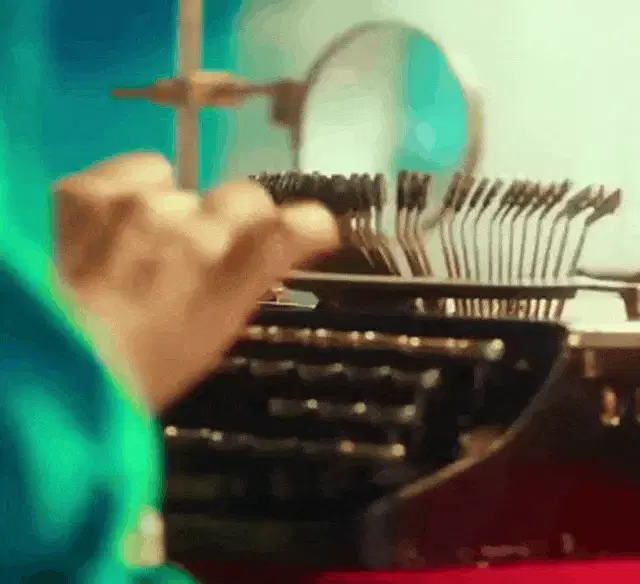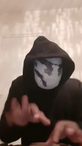 A person in a black hoodie and a Rorschach-like mask rapidly 'typing' on an invisible keyboard.