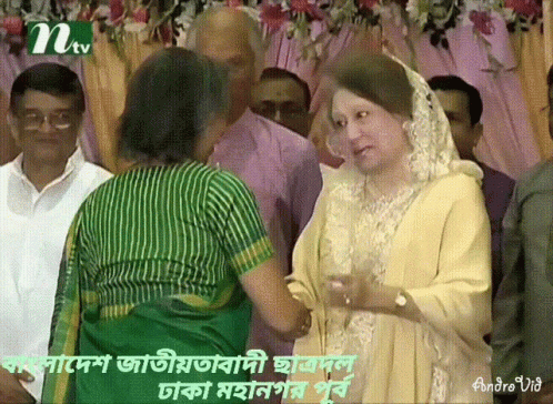 Khaleda Zia greets a woman at a Bangladesh Nationalist Student Party event, with Tarek Zia also associated.