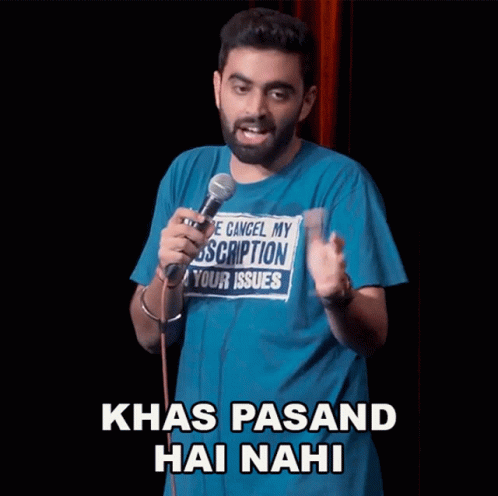 Comedian Rahul Dua delivers a stand-up comedy line, stating 'Khas Pasand Hai Nahi' (I don't particularly like it).