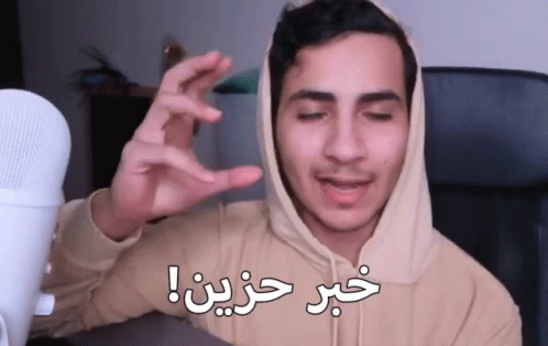 A man in a hoodie shares sad news, with the Arabic text 'Sad news!' displayed on screen.