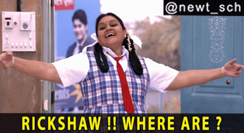 Hansa from Khichdi, played by Supriya Pathak, shouts for a rickshaw with her arms outstretched.