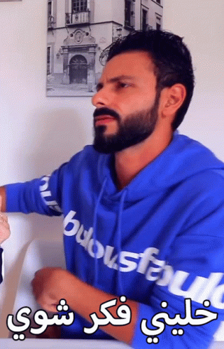 Essam from Essamnour Family, a bearded man in a blue hoodie, deep in thought, saying 'Let me think a little'.