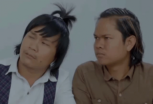 Two men from Khmerfunny in a Cambodian comedy skit, one with a distinctive bun hairstyle.