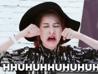 A woman in a black hat cries intensely, covering her ears and making a 'HHUHHHUHUHUHUH' sound.
