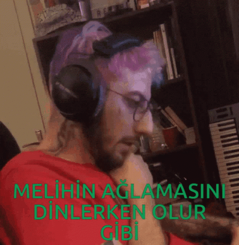 Khontkar, wearing headphones, reacts to Melih's crying, with the caption 'It's like listening to Melih crying'.
