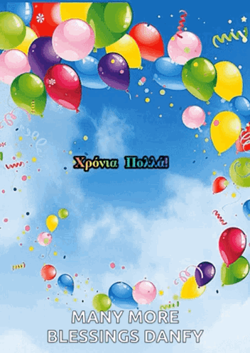 An animated birthday card featuring a vibrant display of colorful balloons and a heartfelt blessing message.