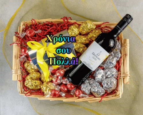 A festive gift basket featuring a bottle of red wine, assorted chocolates, and candies, perfect for a celebration.