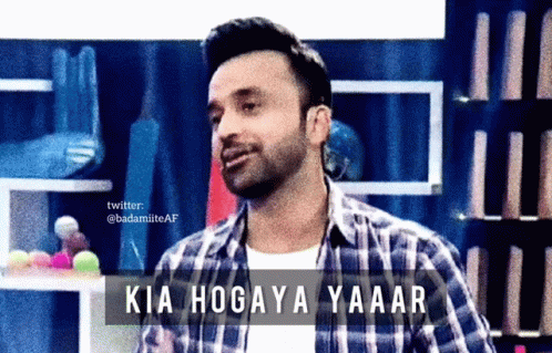 Waseem Badami reacts with a smile as the text 'Kia Hogaya Yaar' appears, expressing surprise or amusement.