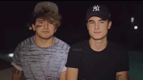 Kian and Jc are seen laughing and smiling together in a dark setting, with Jc wearing a New York Yankees cap.