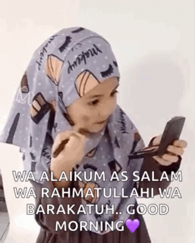 Adorable young girl wearing a patterned hijab, playfully applying makeup while looking into a compact mirror.