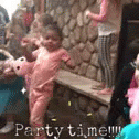 A little girl in pink pajamas holds a stuffed animal, enjoying party time with friends.