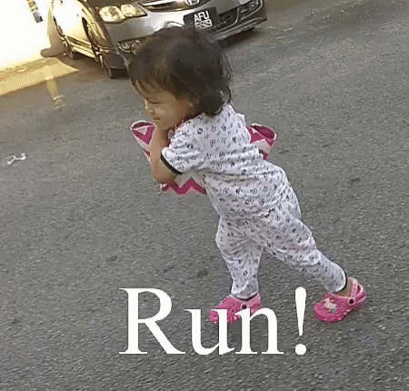 A little girl in pajamas and pink shoes runs down the street with the word 'Run!' overlaid.