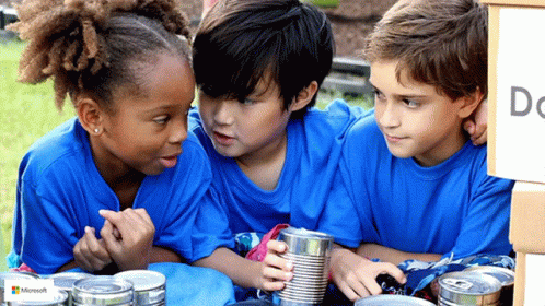 Three children in blue shirts are chatting while looking at cans, with a box labeled "Do" nearby.
