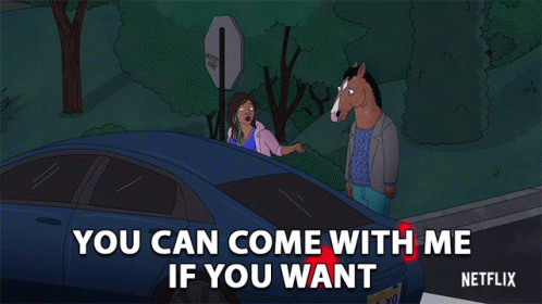 Kiersey Clemons' character and BoJack Horseman's Jameson H stand by a car, with the line "You can come with me if you want."