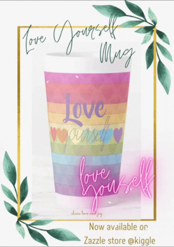 Rainbow 'Love Yourself' mug by Kiggle Design, available on Zazzle, promoting self-love and joy.