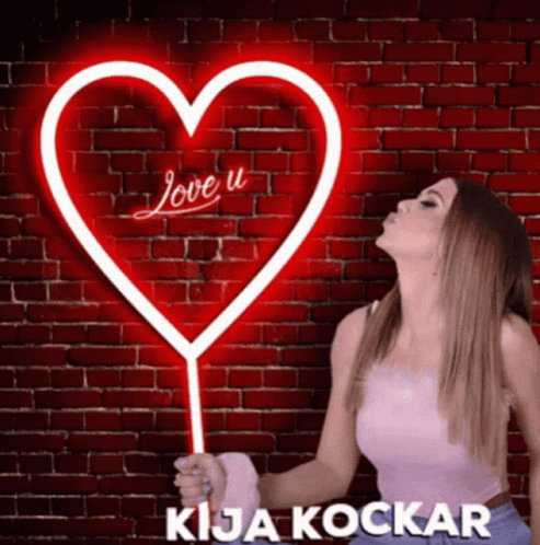 Kija Kockar blows a kiss in front of a neon heart sign displaying 'Kristina' on a red brick wall.