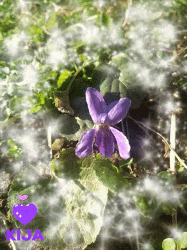 A vibrant purple violet flower with sparkling effects, a heart, and 'Kija' text on a green background.