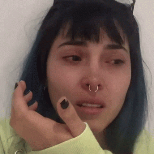 Kika Nieto appears emotional, with blue hair and a nose ring, showing distress.