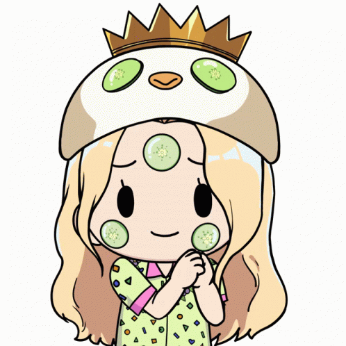 Kiki Verse character Kiki enjoys a relaxing spa day, wearing a penguin hat with cucumber slices.