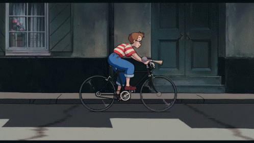Tombo Kopoli from Kiki's Delivery Service cycles through town on his bicycle, a classic Ghibli moment.