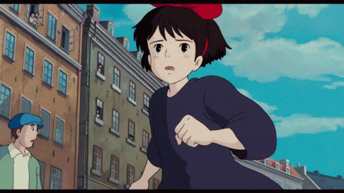 Kiki from Kiki's Delivery Service runs urgently through a bustling city street, looking worried.