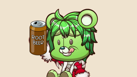 A green Killabears character enjoys a can of root beer, with "Cheers" written below.
