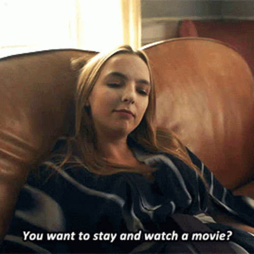 Jodie Comer as Villanelle on a couch, asking 'You want to stay and watch a movie?'
