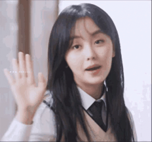 Kim, a young woman in a school uniform, waves her hand with a friendly smile.