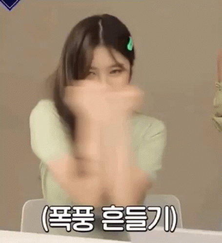 Kim Dayeon of Kep1er energetically shaking her hands with a bright smile, a moment often seen in memes.