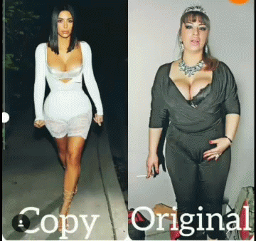 A visual comparison featuring Kim Kardashian labeled 'Copy' and Miljanastar labeled 'Original' with red markings.