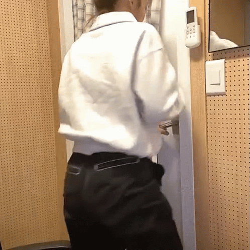 Kim Lip Loona playfully looks back at the camera while exiting a room, wearing a white polo shirt and black pants.