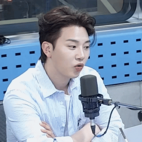 Kim Minseok, from Melomance, speaking into a microphone while wearing a striped shirt.