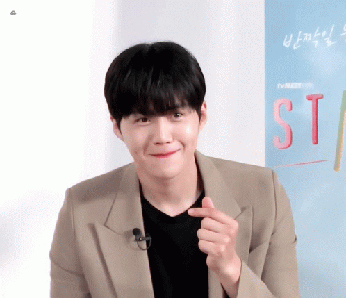 South Korean actor Kim Seonho smiles and makes a finger heart gesture, wearing a beige blazer.