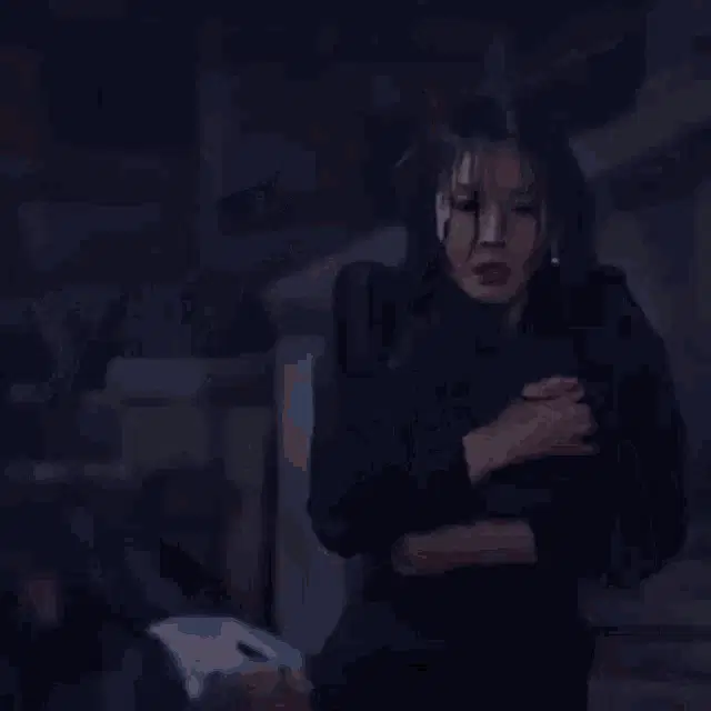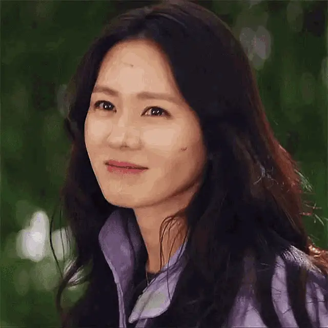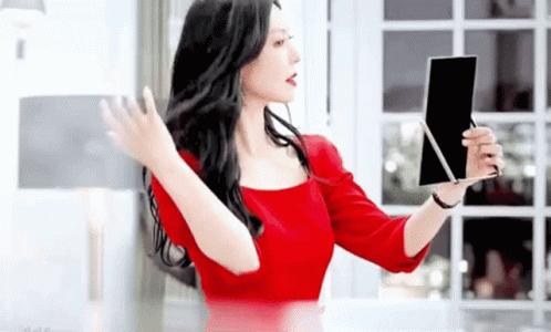 Kim Soyeon as Cheon Seojin in a red dress, checking her appearance in a mirror and adjusting her hair.