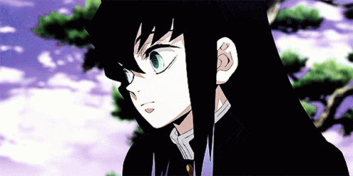 A boy with long black hair and green eyes from Demon Slayer: Kimetsu No Yaiba, looking focused.