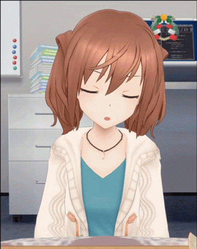 Kimikage Yui from Alice Gear Aegis, a brown-haired anime character, is shown with her eyes closed.