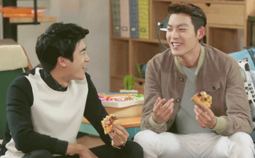Kim Woo-bin and a friend share pizza and laughs, giving a high five, from the drama The Heirs.