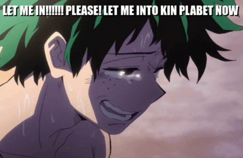 Izuku Midoriya (Deku) from My Hero Academia crying intensely with the meme 'LET ME IN!!!!!! PLEASE! LET ME INTO KIN PLABET NOW'.