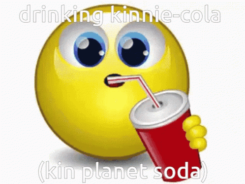 Yellow smiley face emoji with big blue eyes drinking kinnie-cola from a red can with a straw.