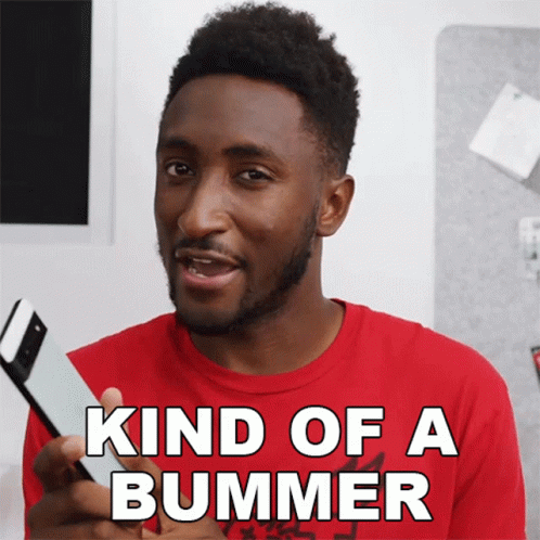 Marques Brownlee expresses disappointment, holding a phone with 'Kind Of A Bummer' text.