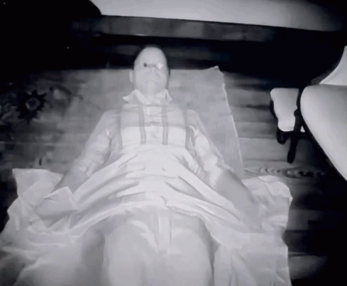 Adam Berry from Kindred Spirits wakes up in a black and white, night vision-like scene.